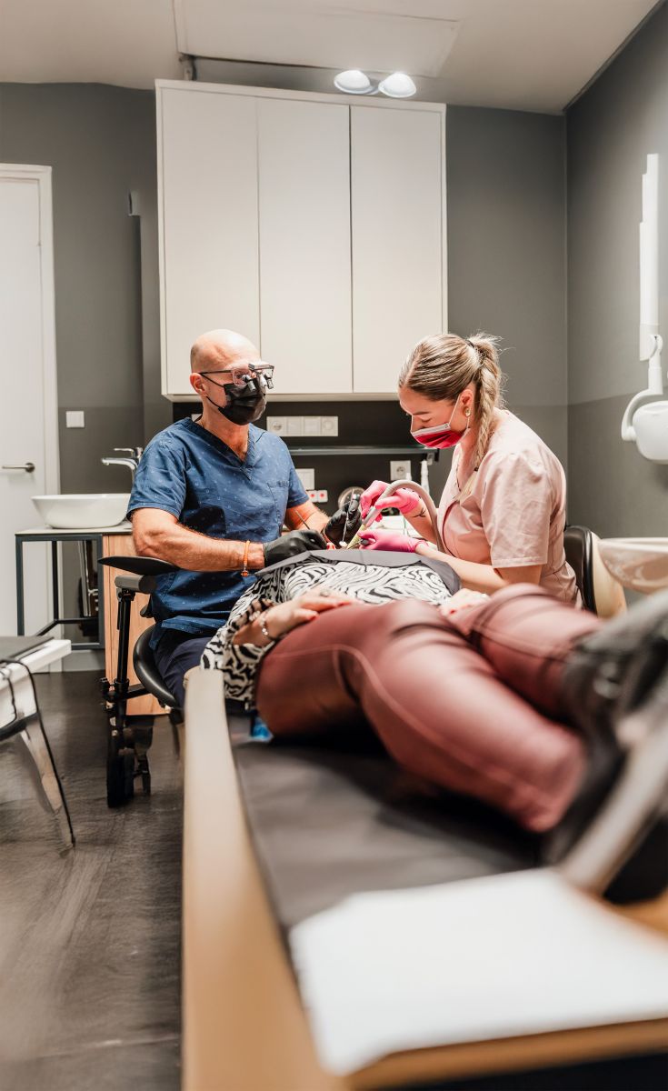 - Čtyřruční asistence u křesla, práce se savkou